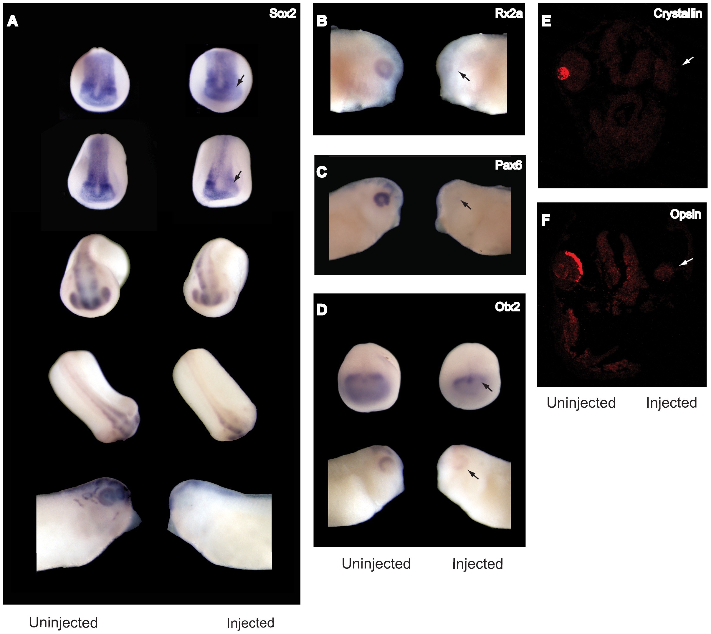 Figure 6. Loss of function of SPC7 diminishes expression of neural and eye markers. (A-D) Whole mount hybridization in situ of embryos injected unilaterally with 90 ng SPC7 morpholino. Injected sides are shown to the right. (A) Frontal, dorsal, and lateral views showing Sox2 expression in control (left) and SPC7-MO unilaterally injected (right) embryos. Early- (top row) and mid-neurula (second row) embryos showing diminished Sox2 staining on the SPC7 morpholino injected side, most obviously in the eye anlage but apparent throughout the head folds (arrows). The loss of expression became more obvious at later stages. Row Three: antero-frontal view of stage 22 embryos. Sox2 staining was undetectable in retina, lens, and neural tube, and was reduced in the midbrain on the injected side. Row 4: dorsal view of the same embryos showing that Sox2 staining was absent in the neural tube on the injected side. Bottom row: Stage 35 embryo showed complete loss of Sox2 staining in the eye on the injected side. (B) Lateral views showing Rx2a expression was not detectable on the injected side (arrow). (C) Lateral views showing Pax6 expression pattern in control (left) and injected (right) stage 267 embryos. Pax 6 staining was absent in the eye field on the injected side (arrow). (D) Otx2 expression in uninjected control (left) and SPC7-MO unilaterally injected (right) embryos. Top row: antero-dorsal view of stage 14 embryos showing significantly diminished Otx2 expression on the injected side (arrow). Bottom row: Lateral views of control (left) and SPC7 MO-injected (right) sides of the same embryo showing barely detectable Otx2 expression on the injected side (arrow). (E, F) Frontal sections through the head of stage 35 embryos injected unilaterally (injected side to the right) with 30 ng SPC7-MO showing expression of β-Crystallin (E) and Opsin (F) expression on the non-injected side only.
