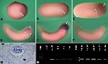 Figure 2. Xenopus MADM-like (xMADML) expression. A-F: Embryonic expression of xMADML by in situ hybridization. Anterior is to the right in all cases. White arrowheads denote the rightlateral extent of anterior staining, and white arrows indicate eye and lens placode staining. A is a dorsal view, dorsal is up in B-F. A: Stage 14: faint xMADML expression visible in the anterior neural plate. The black arrowhead indicates the blastopore, and the dotted line indicates the dorsal midline of the embryo. B: Stage 19: faint xMADML expression visible in a region of the anterior neural plate and adjacent headectoderm. C-E: Stages 25, 32, and 35, respectively: revealing expression in the presumptive lensectoderm (PLE), lens, retina, and surrounding areas. F: Stage 35 sense control showing no staining. G: Section of eye of animal shown in E. H: RT-PCR analysis of xMADML expression in stages as noted. Lane 1 is the 1-kb DNA ladder, lane 2 is a negative control, and lane 3 is positive control plasmid. The white arrow indicates the expected 1,513-bp amplified product, based on the full-length cDNA coding sequence recovered. The white arrowheads indicate two alternative splice forms (see text). ce, corneal epithelium; le, lens; nr, neural retina. Scale bar = 400 mu m in A-F, 100 mu m in G.