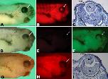 Figure 7. Reciprocal presumptive lensectoderm (PLE) transplants. Embryos were injected unilaterally at the two-cell stage with either morpholino or rhodamine green dextran, and PLEs were transplanted between injected animals at stage 14. The resulting stage 35 larvae are shown. For the panels in the first three columns, anterior is to the right and dorsal is up. Arrows indicate the locations of eyes. For the panels in the fourth column, dorsal is to the right. Each row shows, left to right, one embryo as whole-mount in transmitted light, red morpholino fluorescence, and green dextran fluorescence, and the affected eye in section, respectively. AâD: Rhodamine green dextran host with a red lissamine Xenopus MADM-like (xMADML) morpholino (MO) PLE transplant. EâH: Red lissamine xMADML-MO host with rhodamine green dextran PLE transplant. IâL: Rhodamine green dextran host with a red lissamine control morpholino (CTL-MO) PLE transplant. MâP: Red lissamine CTL-MO host with a rhodamine green dextran PLE transplant. ce, corneal epithelium; le, lens; nr, neural retina. Scale bars = 400 μm in the first three columns, 100 μm in the fourth column.Download figure to PowerPoint