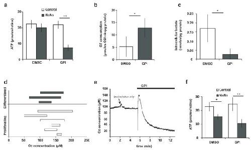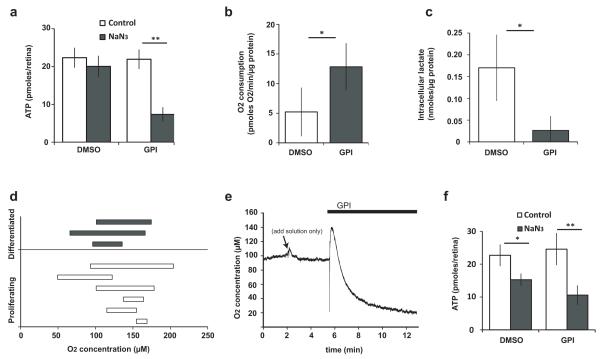 Figure 3. Inhibition of glycogen breakdown shifts energy production from glycolysis to oxidative phosphorylation. (a) ATP levels in freshly explanted proliferating retinas in MBS pre-incubated with GPI for 20 minutes, followed by 10 minutes of NaN3 (DMSO, n=22, p>0.05; GPI, n=27, p=5×10−12). (b) Rate of oxygen consumption in fresh retinal explants incubated with GPI in L15 (n=9, p<0.05). (c) Intracellular lactate in retinal explants incubated for 3 hours with GPI (n=4, p=0.01). (d) Each bar represents the range of [O2] sampled from various points in the retina of a live embryo at stage 25 (proliferating) or stage 41 (differentiated). (e) Addition of GPI in the medium while recording from a specific point in the proliferating retinas lowers [O2] (4/4 experiments, decrease ranging from 8-73 μM O2, depending on the depth sampled from the surface; no decrease observed with control solutions; the momentary upward spike is a response to adding more solution). (f) Inhibition of oxidative phosphorylation with NaN3 at stage 25 in vivo reduced ATP in the retina to a greater extent in GPI treated embryos (57% drop, n=8, p=0.0004) compared to controls (33% drop, n=9, p=0.005).