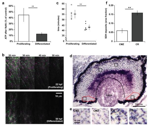 Figure 2. Metabolic differences between progenitors and differentiated cells are also present in the postembryonic retinal stem cell niche, and in the zebrafish retina. (a) ATP levels in freshly explanted zebrafish retinas in L15 after inhibition of oxidative phosphorylation with NaN3 for 10 minutes (P, n=14, p=0.0002; D, n=15, p=4×10−8; P-D comparison, p=8×10−7). (b) EB3-GFP imaging in the zebrafish retina. Each panel is the merged image of two frames 20 seconds apart, coloured green or magenta, at the indicated time after Antimycin A. Dots that moved between frames should be green or magenta. Proliferating cells (top) keep up EB3-GFP motion for longer than differentiated cells (bottom). (c) Time taken after Antimycin A for the EB3-GFP motion to stop in differentiated 50-54 hpf retinas (n=7 movies) and proliferating 22-26 hpf retinas (n=6). Averages shown next to individual data points (p=0.0002). (d) Dark deposits as a result of SDH activity in a retinal section that includes proliferating ciliary margin zone cells (CMZ, circumscribed in red) and differentiated central retina cells (CR, region between the pigmented epithelium, lens and CMZ). (e) Magnification of the boxes in (d) showing that deposits in the CMZ are both fainter and less dense than in the CR. (f) Quantification of the area fraction covered by deposits (n=43, p<10−10).