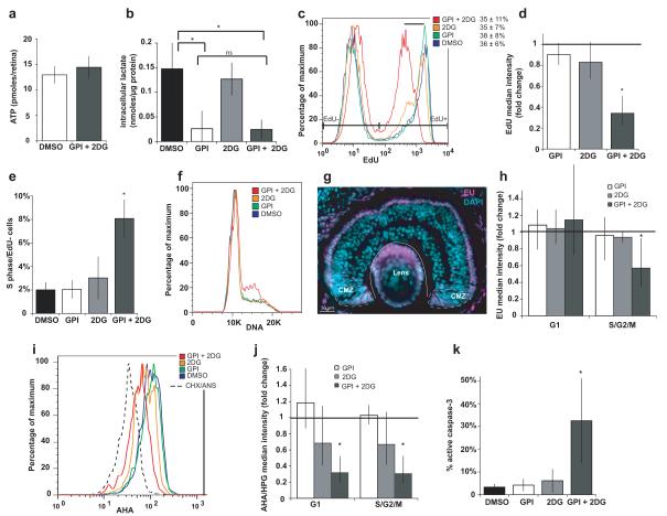 Figure 5. Complete glycolytic block inhibits progenitor proliferation, biosynthesis and survival. (a) ATP in explants in MBS does not change after 30 minutes of GPI+2DG (n=20). (b) Intracellular lactate after 3 hours of GPI and/or 2DG (data from the same set of experiments as Fig. 3c and Supplementary Fig. 1f; GPI + 2DG, n=6, p=0.003 compared to control, p>0.05 compared to GPI). (c-f) GPI+2DG but not either drug alone, for 8-10 hours in MBS in explants: (c-d) reduces EdU incorporation per cell after a short pulse (n=4, p=0.006) (black bar indicates shift in histogram) but not % EdU+ cells, (e) increases the proportion of S phase cells which do not incorporate EdU (n=3, p=0.02), (f) causes cells to accumulate in S phase (observed in 10/11 experiments for GPI+2DG; 3/13 for GPI and 1/11 for 2DG). (g) The nucleotide analogue 5-ethynyl-uridine (EU) is incorporated in RNA at much higher levels in CMZ proliferating cells and in photoreceptors compared to other retinal differentiated cells in vivo (stage 41). (h-k) GPI + 2DG but not either drug alone (h) reduces incorporation of EU into RNA in S/G2 (n=4, p=0.03), (i-j) reduces incorporation of the methionine analogues AHA or HPG into proteins in G1 (n=4, p=0.02) and S/G2 (n=4, p=0.02) (dashed histogram is background fluorescence when the protein synthesis inhibitors cycloheximide + anisomycin are used with AHA), and (k) increases the proportion of active-caspase-3+ apoptotic cells (n=5, p=0.03).