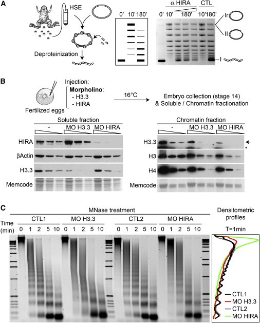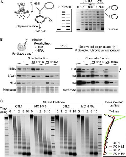 (C) MNase digestion profile of H3.3 and HIRA MO injected embryos. We injected 18.4 ng of H3.3 and 138 ng of HIRA MO in fertilized eggs. After incubation to reach stage 14 in noninjected controls (CTL1 and 2), 40 embryos in each case were used to prepare nuclei that we subjected to MNase digestion for increasing indicated incubation times. For each time point, we purified the resulting DNA fragments from the equivalent of 1.5 embryos to be analyzed by electrophoresis on agarose gel stained with ethidium bromide. Densitometric profiles of the 1 min digestion products are shown on the right.