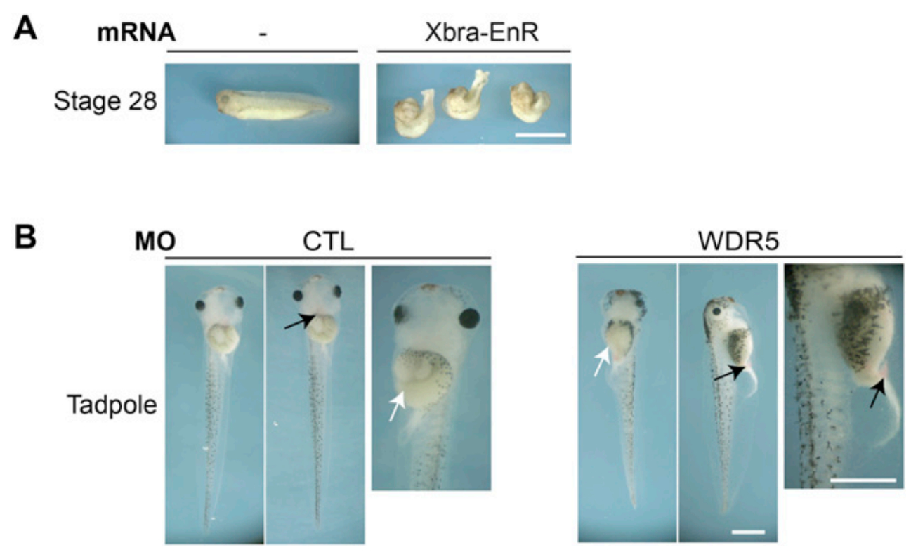 (A) Xbra-EnR phenotype. We injected Xbra-EnR mRNA (500 pg) in one cell of two-cell stage embryos and acquired images when controls reached stage 28. Xbra-EnR injected embryos exhibit defects of the posterior mesoderm development. Scale bar: 1 mm. (B) WDR5 phenotype. We injected indicated MO (46 ng) in one cell of two-cell stage embryos and acquired images when control embryos reached the tadpole stage. MO WDR5-injected tadpoles exhibit abnormal distribution of blood cells (blood is absent from heart while forming a hemorrhage in the tail â black arrows), and failure of gut patterning (white arrows). Some tadpoles also exhibited body curvature (not shown). Scale bar: 1 mm.