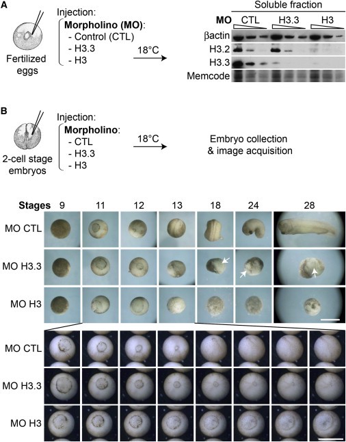 (B) H3.3 and H3 downregulation leads to distinct phenotypes. The scheme shows injections of indicated MO (4.6 ng) in one cell of 2-cell stage embryos. We kept embryos at 18�C and acquired images at the indicated stages (using control embryos as a reference). White arrows point to the gastrulation defects in H3.3 morphants. In the bottom panel, we show a broader coverage of the gastrulation time period (stages 11�13) with eight distinct time points (see also Movie S1). Scale bar: 1 mm.