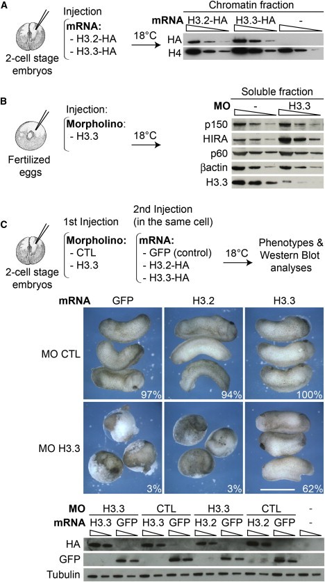 (A) Dose-dependent phenotype of H3.3 and HIRA morpholinos. We injected CTL, H3.3 or HIRA MO (at the indicated doses) in one cell of two-cell stage embryos and acquired images when control embryos reached stage 28. Scale bar: 1 mm.