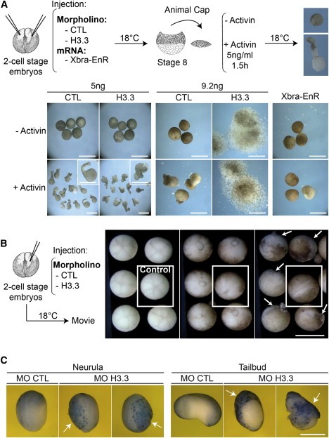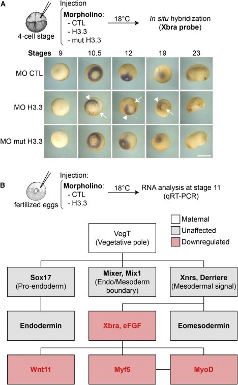 (A) Xbra expression pattern defects in H3.3 morpholino injected embryos. The scheme shows injections of indicated MO (69 ng of CTL, 4.6 ng of either H3.3 or mutH3.3 MO) in one cell of 4-cell stage embryos. After incubation to reach the indicated stages in controls, we fixed embryos and performed whole mount in situ hybridization with an Xbra probe. White arrows indicate the injected part and arrowheads the noninjected part of H3.3 morphants. Scale bar: 1 mm.