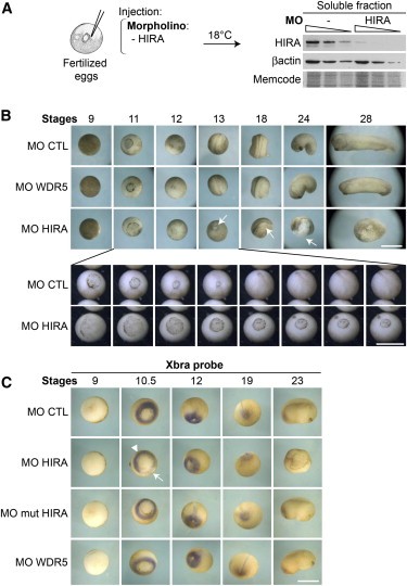 (A) Specificity of HIRA morpholinos. (Left) The scheme shows injections of HIRA MO (92 ng) in fertilized eggs. After incubation to reach stage 11 in controls, 40 noninjected () and 40 injected (MO HIRA) embryos were used to prepare soluble extracts for western blot analysis. (Right) Results used a 2-fold dilution series (gradient bar) with the highest quantity being equivalent to three embryos, and detection with a HIRA antibody. Anti-β-actin and memcode staining served as loading controls.