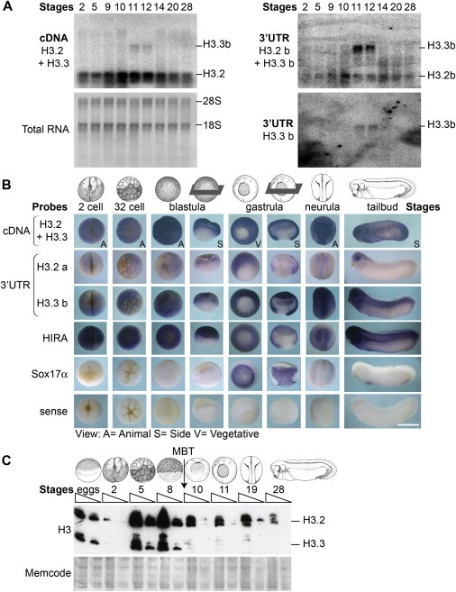 (A) H3 and H3.3 expression levels by Northern Blot. We extracted total RNAs from embryos at indicated developmental stages for analysis of H3.2 and H3.3 transcripts by Northern Blot. We show the signals for total H3 transcripts (H3.2+H3.3 cDNA), total RNA visualized by methylene blue (revealing the 28S and 18 s rRNAs), H3.2 and H3.3 single transcripts (H3.2b+H3.3b 3â²UTR) and single H3.3 transcript (H3.3b 3â²UTR).