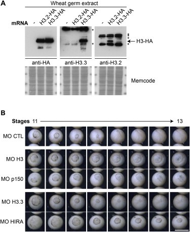 (B) HIRA downregulation affects the level of H3.3 in the chromatin. The scheme shows injections of indicated MO (18.4 ng for H3.3 and 138 ng for HIRA) in fertilized eggs. After incubation to reach stage 14 in controls (â), 40 embryos in each case were used to prepare soluble and chromatin fractions for western blot analysis. Results used a 2-fold dilution series (gradient bar) with the highest quantity being equivalent to three embryos, and detection with antibodies. Anti-βâactin and memcode staining served as loading controls. We note that H3.3 downregulation leads to overexpression of HIRA in soluble fractions.