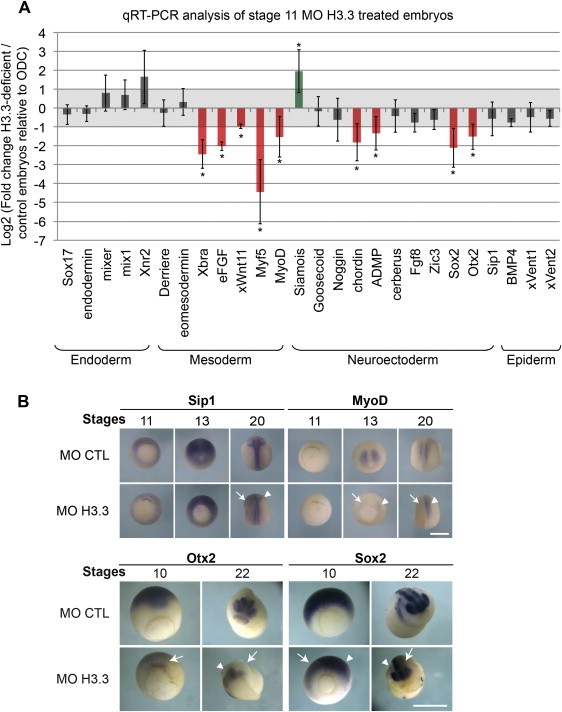 (A) qRT-PCR expression profiling of MO H3.3 treated embryos. We injected CTL or H3.3 MO (9.2ng) in fertilized eggs. After incubation at 18�C to reach stage 11 (gastrula) in controls, embryos were used in each case to prepare total RNA extracts and were analyzed by qRT-PCR of indicated genes. We represent graphically in a log2 scale the fold changes between MO H3.3 and MO CTL embryos, first normalized to the housekeeping gene ODC. We classified genes according to their importance for the endoderm, mesoderm, neuroctoderm or epiderm regulatory networks. Red shows genes that are significantly downregulated in MO H3.3, while green indicates significantly overexpressed genes. In gray are genes whose expression is not affected (â Paired Student's t test p-value < 0.05). Plotted are means and standard deviations of 8 independent experiments performed in duplicates.