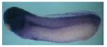 Histone cell cycle regulator (hira) gene expression in Xenopus laevis embryo, assayed via in situ hybridization, NF stage 19, dorsal view, anterior up.