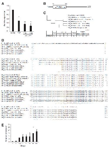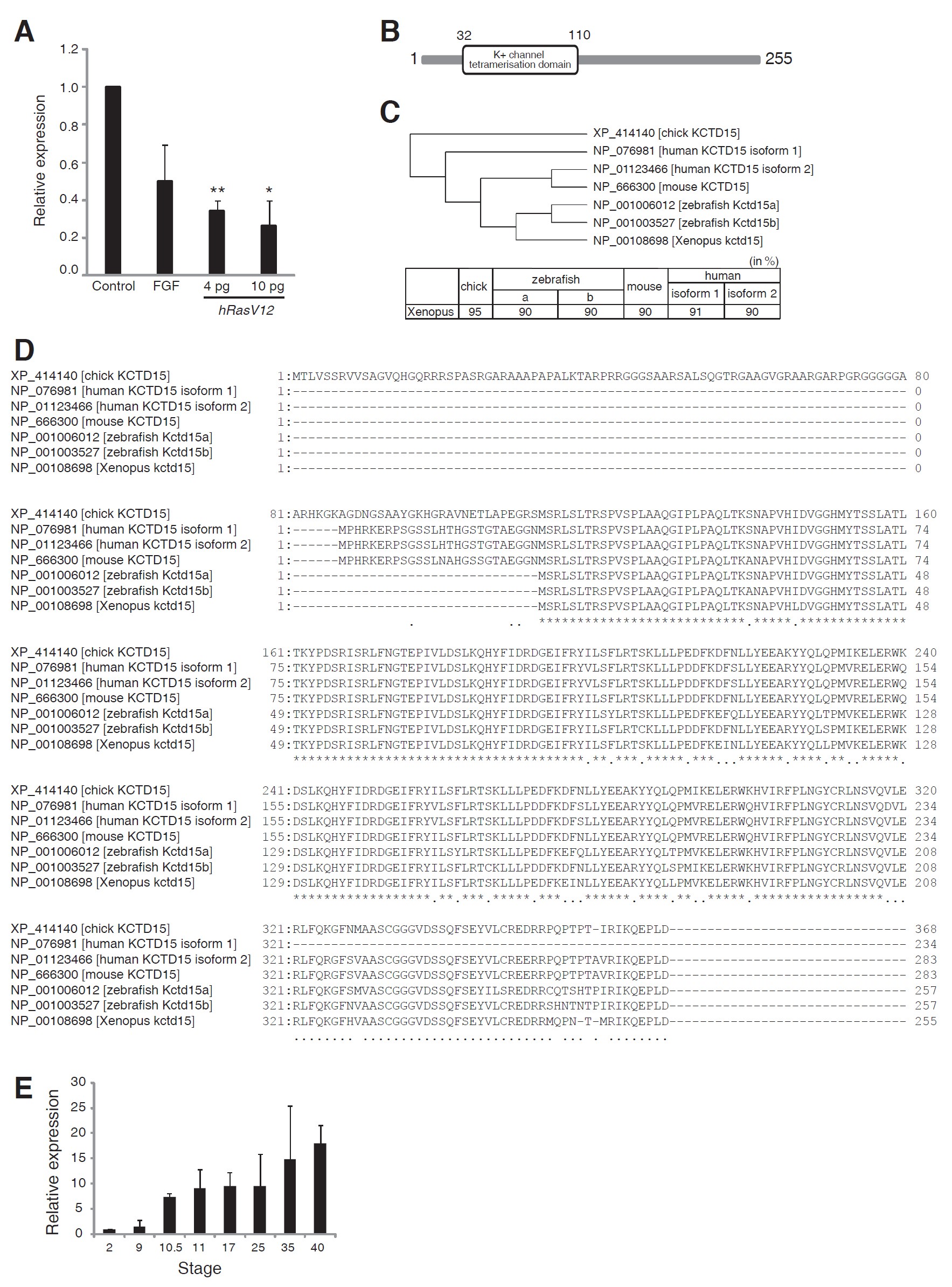 Fig. 1. Evolutionary conservation of Xenopus kctd15, a novel FGF-repressed gene. (A) Xenopus Kctd15 expression is repressed by FGF or RasV12 in ectodermal explants. hRasV12 mRNA was injected into the animal poles of four-cell stage embryos. Ectodermal explants derived from uninjected or injected embryos were left untreated or treated with 100 ng/ml FGF. At stage 11, explants were harvested for RNA preparation. The expression level of kctd15 was determined by real-time quantitative RT-PCR and normalized relative to that of ef1a. Shown is the average of two independent experiments. The error bar represents the standard deviation (SD). Significant differences are marked by asterisks (*p < 0.05, **p < 0.01, unpaired t test). P values versus control were as follows: 0.067 for FGF-treated explants, 0.0030 for hRasV12 mRNA (4 pg)-injected explants, and 0.016 for hRasV12 mRNA (10 pg)-injected explants. (B) Schematic representation of Xenopus kctd15 protein. Xenopus kctd15 consists of 255 amino acids and has the potassium channel tetramerization domain at the N-terminus. (C) A phylogenetic tree of vertebrate KCTD15 proteins. The tree was drawn by the BLAST TreeView Widget (http://blast.ncbi.nlm.nih.gov/). Genetic distances were calculated from the aligned sequences by using the Grishin distance model. The tree was built with the Fast Minimum Evolution method. Identity of amino acid sequences among vertebrate KCTD15 orthologs is shown in the table. (D) Alignment of vertebrate KCTD15 protein sequences. Asterisks mark amino acid residues conserved in all species. Periods mark amino acid residues conserved in at least 4 out of 7 species. (E) Temporal expression of Xenopus kctd15 in early development. The total RNA isolated from embryos at indicated stages was subjected to real-time quantitative RT-PCR. The expression level of kctd15 was normalized relative to that of odc. Shown is the average of two independent experiments. The error bar represents the standard deviation (SD).