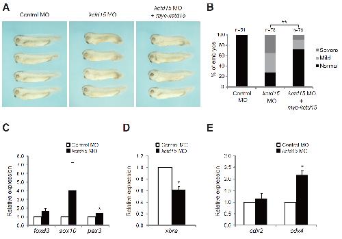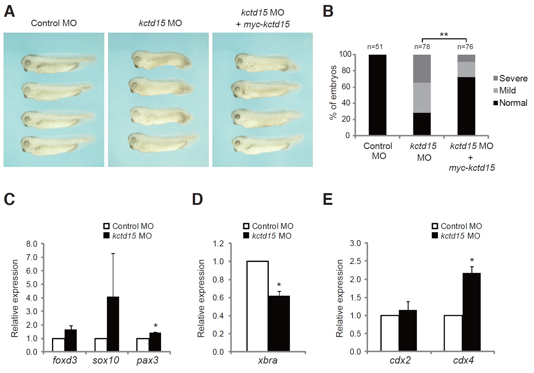 Fig. 5. Essential role of Xenopus kctd15 in ventral development. (A) Control MO (80 ng) or kctd15 MO (80 ng) was injected into the animal pole of each ventral blastomere at the four-cell stage. For rescue experiments, myc-kctd15 mRNA (700 pg) was coinjected with kctd15 MO (80 ng). At the late tailbud stage, injected embryos were photographed with anterior to the left and dorsal to the top. (B) Obtained phenotypes were classified into three groups (severe, mild or normal) according to the extent of defects in ventral and caudal morphologies. **, P < 0.01. Fisher exact test was used to compare the frequency of normal development between embryos injected with kctd15 MO alone and those injected with kctd15 MO plus myc-kctd15 mRNA. P = 2.7 x 10-5. (C-E) Real-time quantitative RT-PCR analysis of marker gene expression. Embryos ventrally injected with control MO (80 ng) or kctd15 MO (80 ng) were cultured until stage 15 (C), 19 (D) or 24 (E). The relative expression levels of the indicated genes were normalized to that of odc. Shown is the average of two independent experiments. The error bar represents SD. *P < 0.05, **P < 0.01, unpaired t test. P values versus control were as follows: 0.085 for foxd3 expression, 0.30 for sox10 expression, 0.00065 for pax3 expression, 0.0089 for xbra expression, and 0.48 for cdx2 expression, and 0.011 for cdx4 expression.