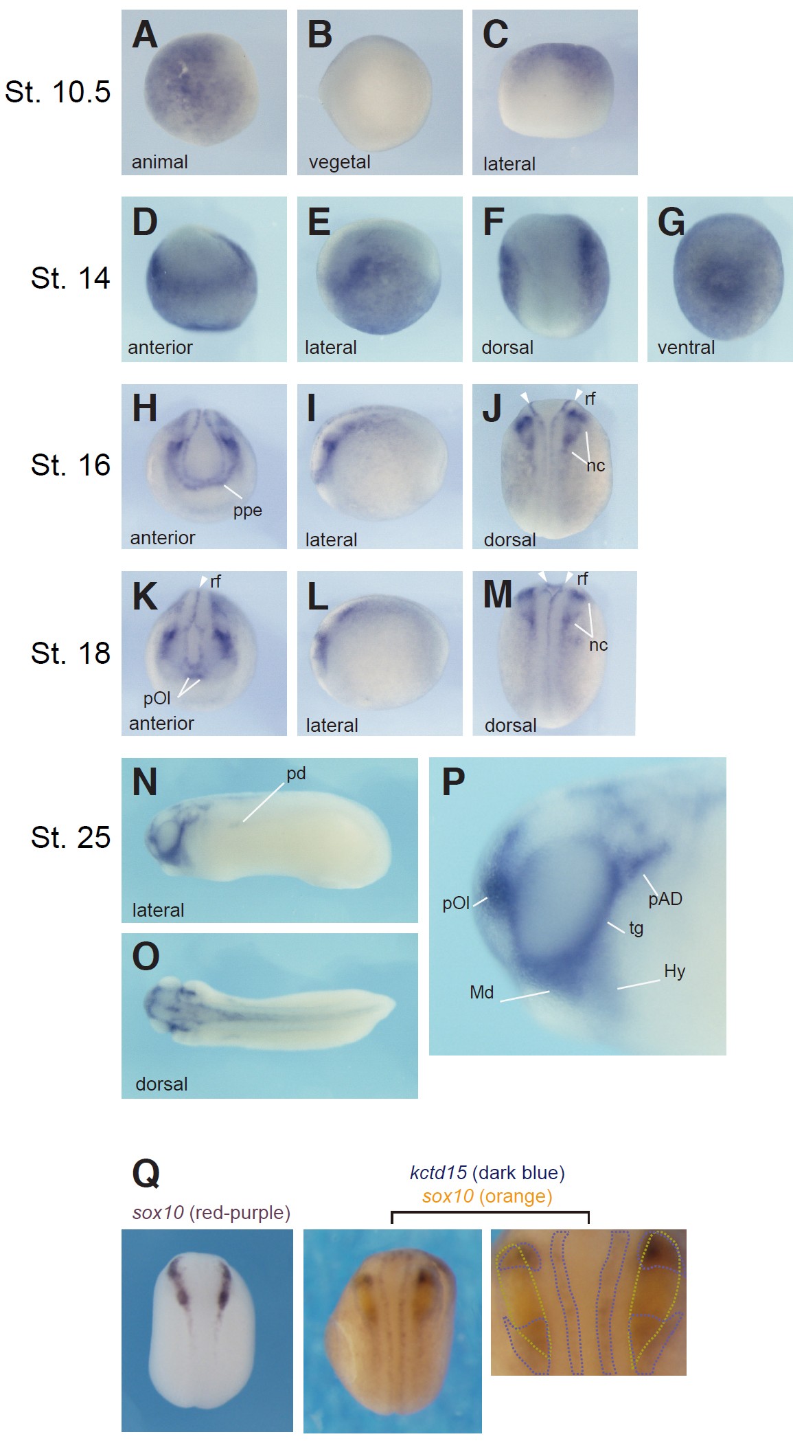 Fig. 2 Spatial expression of Xenopus kctd15 in early development. Whole mount in situ hybridization against kctd15 was performed on embryos from indicated stages. No detectable signal was seen with the sense probe (data not shown). (A-C) At stage 10.5, kctd15 was uniformly expressed throughout the presumptive ectoderm. (D-G) At stage 14, kctd15 expression was detected in the non-neural ectoderm and was excluded from the neural plate. Dorsal is upward in D and E. Anterior is upward in F and G. (H-J) At stage 16, kctd15 expression was detected in the preplacodal ectoderm (ppe), the neural crest (nc) and the roof plate (rf). Dorsal is upward in H and I. Anterior is upward in J. (K-M) At stage 18, kctd15 expression was detected in the neural crest (nc), the roof plate (rf) and the olfactory placode (pOl). Dorsal is upward in K and L. Anterior is upward in M. (N-P) At stage 25, kctd15 expression was detected in the pronephric duct (pd), the mandibular arch (Md), the hyoid arch (Hy), the olfactory placode (pOl), trigeminal ganglia (tg) and the anterodorsal lateral line placode (pAD). Anterior is left. (Q) Whole mount double in situ hybridization against kctd15 and sox10 was performed on stage 17 embryos (middle and right panels). The right panel is an enlarged view of the middle panel. Dark blue and orange dotted lines mark the kctd15-expressing and sox10-expressing area, respectively. For reference, single in situ hybridization against sox10 (red purple) was also performed (the left panel). All panels are dorsal views with anterior to the top.