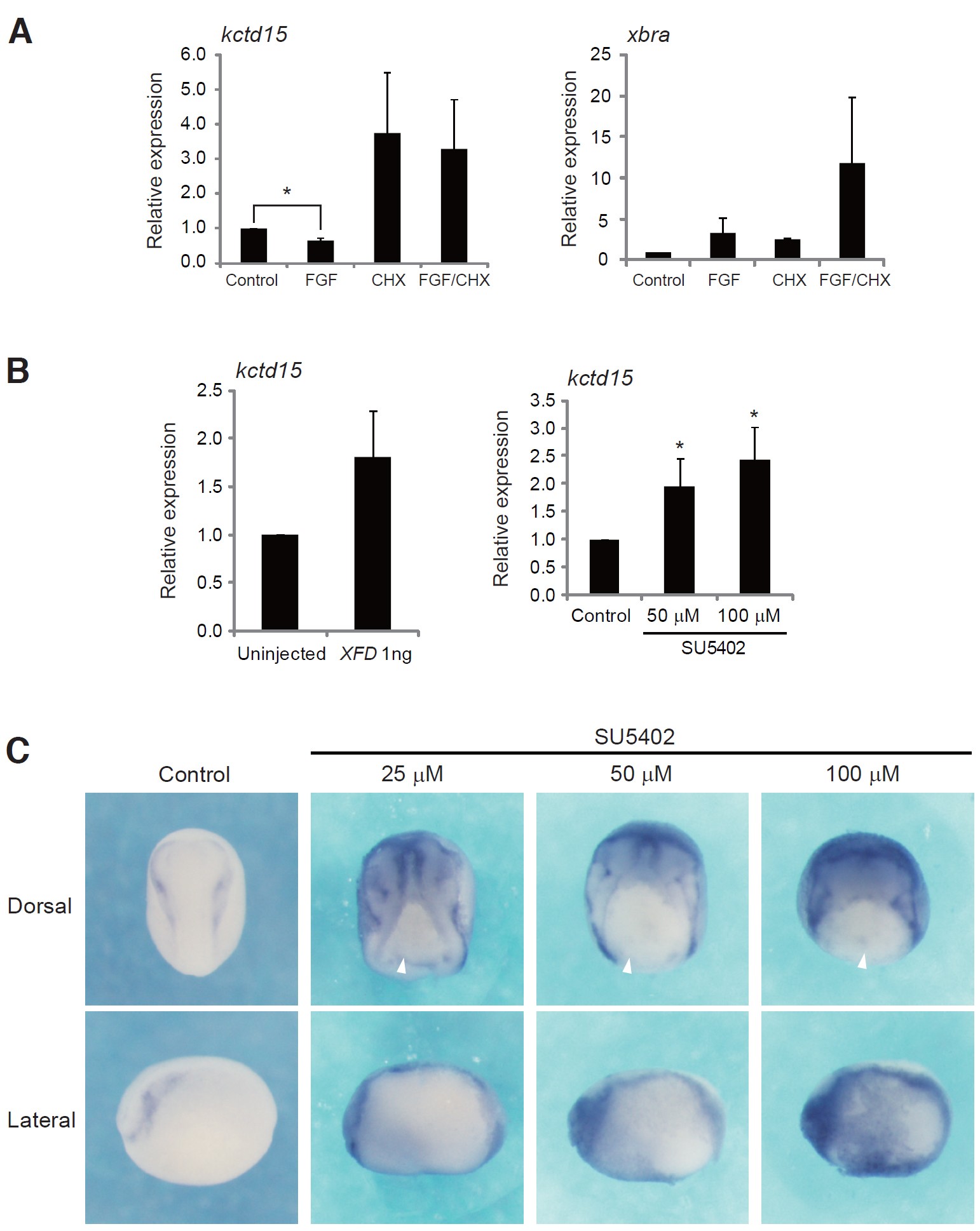 Fig. 3. FGF signaling inhibits Xenopus kctd15 expression in vivo. (A) FGF represses kctd15 expression indirectly. Animal caps were dissected at stage 10.25, treated with FGF (100 ng/ml) for 3 hours in the presence or absence of cycloheximide (CHX; 5 mg/ml), and then harvested for real-time quantitative RT-PCR analysis. Shown is the average of two independent experiments. The error bar represents SD. Significant differences are marked by asterisks (*p < 0.05, unpaired t test). P values (FGF treatment versus no FGF treatment) were as follows: 0.024 for kctd15 expression in the absence of CHX, 0.80 for kctd15 expression in the presence of CHX, 0.23 for xbra expression in the absence of CHX, and 0.24 for xbra expression in the presence of CHX. (B) Inhibition of FGF signaling increases the abundance of kctd15 mRNA. XFD mRNA (1 ng) was injected into animal poles at 2-cell stage, and injected embryos were harvested at stage 11 for real-time quantitative RT-PCR analysis (left). Embryos were treated with indicated doses of SU5402 at stage 9, and then harvested at stage 11 for real-time quantitative RT-PCR analysis (right). Shown is the average of two (left) or three (right) independent experiments. The error bar represents SD. *P < 0.05, unpaired t test. P values versus control were as follows: 0.14 for XFD mRNA-injected embryos, 0.031 for SU5402 (50 mM)-treated embryos, and 0.015 for SU5402 (100 mM)-treated embryos. (C) Inhibition of FGF signaling dramatically expands the region expressing kctd15. Embryos were treated with indicated doses of SU5402 at stage 9, fixed at stage 15, and then subjected for whole mount in situ hybridization against kctd15. Upper panels show dorsal views with anterior toward the top. Lower panels show lateral views with anterior to the left. White arrowheads indicate unclosed blastopores, which are commonly observed phenotypes caused by inhibition of the FGF pathway (Amaya et al., 1991; Chung et al., 2004).