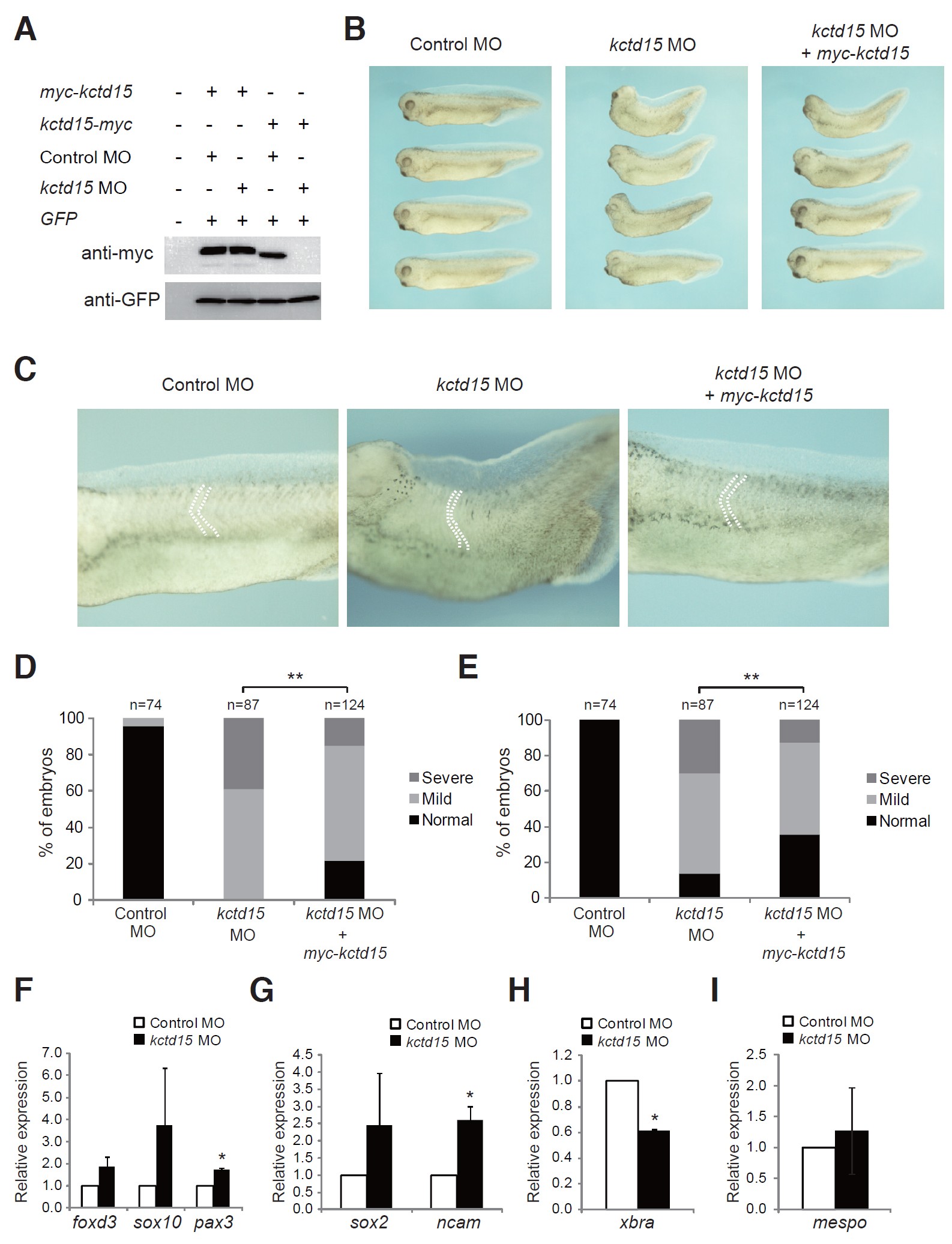 Fig. 4. Essential role of Xenopus kctd15 in dorsal development. (A) The specificity and efficiency of kctd15 MO. The combination of GFP mRNA (200 pg) plus control MO (80 ng) or kctd15 MO (80 ng) was co-injected with myc-kctd15 (800 pg) or kctd15-myc mRNA (800 pg) into Xenopus embryos. Injected embryos were harvested for immunoblotting at stage 10.5. (B,C) Control MO (80 ng) or kctd15 MO (80 ng) was injected into the animal pole of each dorsal blastomere at the four-cell stage. For rescue experiments, myc-kctd15 mRNA (800 pg) was coinjected with kctd15 MO (80 ng). At the late tailbud stage, injected embryos were photographed with anterior to the left and dorsal to the top. White dotted lines in C represent somite boundaries. (D) Obtained phenotypes were classified into three groups (severe, mild or normal) according to the extent of defects in head morphologies. **, P < 0.01. Fisher exact test was used to compare the frequency of normal head development between embryos injected with kctd15 MO alone and those injected with kctd15 MO plus myc-kctd15 mRNA. P = 6.5 x 10-8. (E) Obtained phenotypes were classified into three groups (severe, mild or normal) according to the extent of defects in somite morphologies. **, P < 0.01. Fisher exact test was used to compare the frequency of normal somite development between embryos injected with kctd15 MO alone and those injected with kctd15 MO plus myc-kctd15 mRNA. P = 0.00045. (F-I) Real-time quantitative RTCR analysis of marker gene expression. Embryos dorsally injected with control MO (80 ng) or kctd15 MO (80 ng) were cultured until stage 15 (F, G) or 19 (H, I). The relative expression levels of the indicated genes were normalized to that of odc. Shown is the average of two (F-H) or four (I) independent experiments. The error bar represents SD. *P < 0.05, **P < 0.01, unpaired t test. P values versus control were as follows: 0.11 for foxd3 expression, 0.27 for sox10 expression, 0.0046 for pax3 expression, 0.31 for sox2 expression, 0.029 for ncam expression, 0.00083 for xbra expression, and 0.47 for mespo expression.