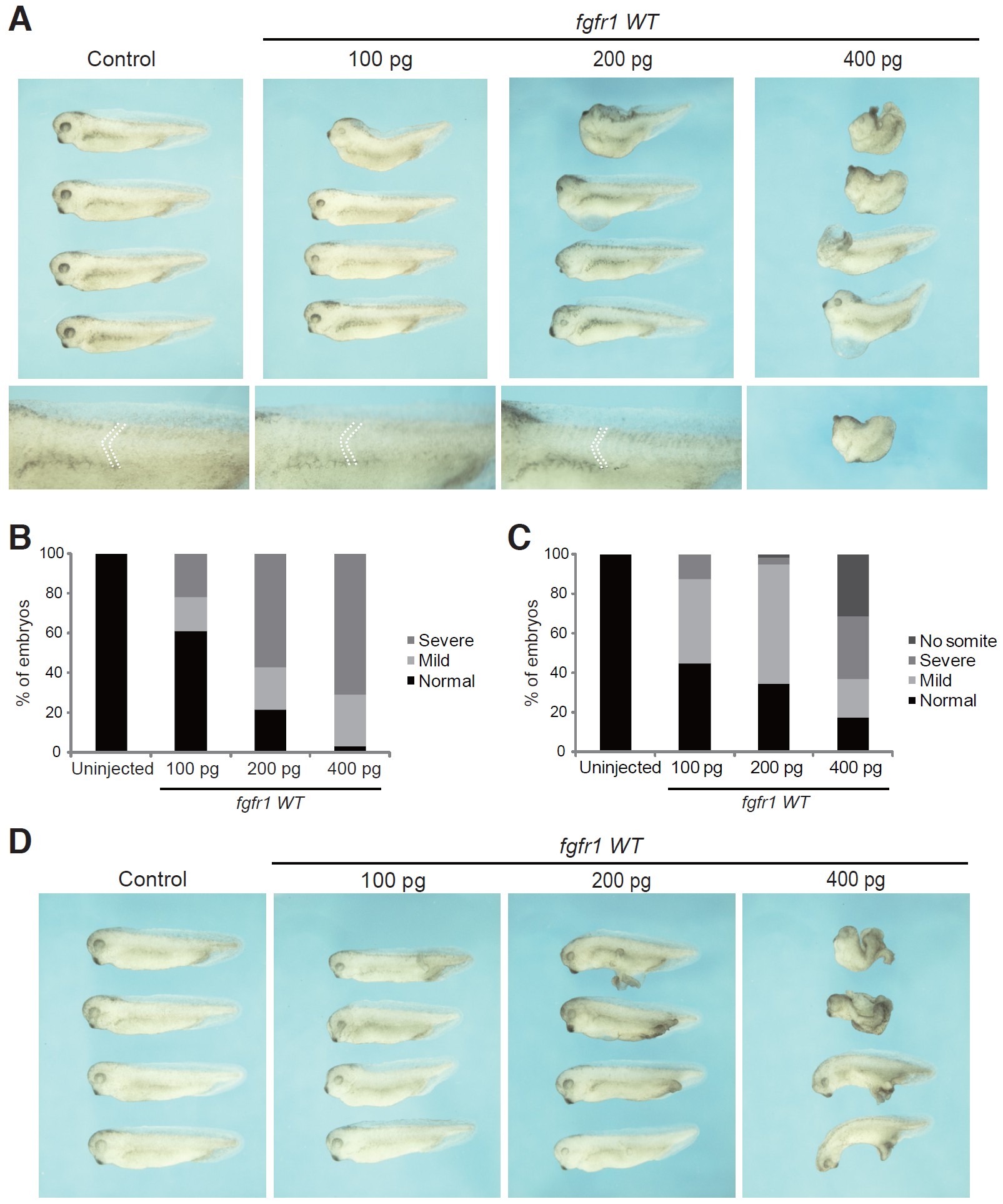 Fig. 6. Ectopic dorsal expression of fgfr1 phenocopies dorsal depletion of Xenopus kctd15. (A) The indicated dose of fgfr1 WT mRNA was injected into the animal pole of each dorsal blastomere at the four-cell stage. Embryos were photographed at the late tailbud stage. (B) Obtained phenotypes were classified into three groups (severe, mild or normal) according to the extent of defects in head morphologies. (C) Obtained phenotypes were classified into four groups (no somite, severe, mild or normal) according to the extent of defects in somite formation. (D) The indicated dose of fgfr1 WT mRNA was injected into the animal pole of each ventral blastomere at the four-cell stage. Embryos were photographed at the late tailbud stage.