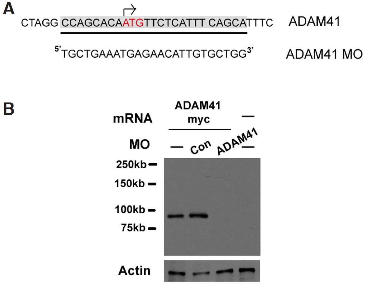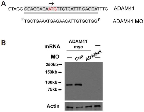 Fig. 4. Inhibition of ADAM41 translation by a specific antisense morpholino. (A) A morpholino (MO) was designed to target underlined sequence covering the translational start site (indicated in red) in adam41 mRNA. (B) ADAM41 morpholinos blocked the translation of myc-tagged exogenous ADAM41 mRNA. The indicated morpholinos were co-injected with exogenous myc-tagged adam41 mRNA into X. tropicalis embryos at one-cell stage, and Western blot was carried out using an anti-myc antibody. Each lane contains 10 embryo equivalent of total protein.