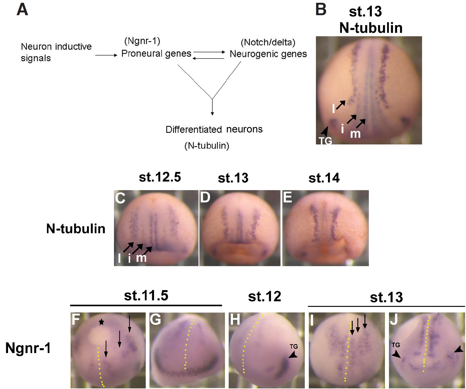 Fig. 5. In situ hybridization of neural markers in normal X. tropicalis embryos. (A) Neural induction in Xenopus involves multiple events. Early neural induction signals activate proneural genes that specify neural fate of ectodermal cells. Ngnr-1 is a strongly expressed proneural gene in X. tropicalis. Proneural genes coordinate with neurogenic genes, such as notch/delta, to define neuronal pattern. (B-E) Dorsal view of X. tropicalis embryos demonstrating primary neuron patterning as seen by whole-mount in situ hybridization for the neuron marker N-tubulin. Three stripes of neurons, medial neurons (m), intermediate neurons (i), and lateral neurons (l), form in parallel to each other (arrows in B and C) on both sides of dorsal midline axis. Arrowhead in (B) points to the trigeminal ganglion (TG) in the anterior neural plate of the embryo. (F-J) Whole-mount in situ hybridization for the proneural gene ngnr-1 in X. tropicalis embryos at different stages. (F) Ngnr-1 message is first expressed dorsally as three stripes on each side of the midline at st.11.5 (arrows denote dorsal ngnr-1 expression, and star indicates blastopore surrounding circular yolk plug). At this stage ngnr-1 is also expressed in the anterior region (G, anterior view of embryo with dorsal side at the top). The dorsal stripes elongated and migrated toward the midline