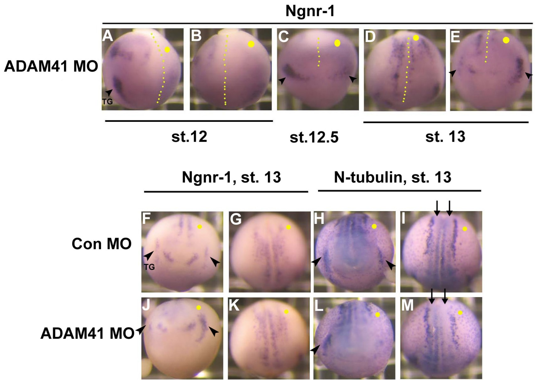Fig. 6. Knockdown of ADAM41 caused a developmental delay at neurula stages. Embryos were injected in one cell at 2-cell stage with the indicated morpholinos. Injected side is marked by yellow dot in each panel, and dotted yellow lines indicate midline position in (A-E). (A-E) Injection of ADAM41 morpholino resulted in a delay of ngnr-1 expression pattern in the trigeminal ganglia at late gastrula stages. The side injected with ADAM41 morpholino had reduced ngnr-1 expression while the uninjected side had normal ngnr-1 expression pattern at st.12 (A,B are different views of the same embryo). The ADAM41 morpholino injected side started to express ngnr-1 at st.12.5 (C) (anterior view). By stage 13, expression of ngnr-1 in the trigeminal ganglion at the uninjected side had significantly decreased (D,E are different views of the same embryo). In contrast, ngnr-1 was more pronounced in the ADAM41 morpholino injected side compared with uninjected side at st. 13; see arrowheads in (E). (F-M) Effects of ADAM41 knockdown on the expression of ngnr-1 and N-tubulin at st. 13. Control morpholino did not alter the early patterns of primary neurons (G,I) or anterior neural placodes (F,H). ADAM41 knockdown resulted in an enlarged expression domain of ngnr-1 as the embryos developed (I, arrow). Anterior ngnr-1 expression decreased and was restricted to neural placodes including the trigeminal ganglion (TG) in st.12/13 embryos (arrowheads in H and J; embryo in H is tilted to the left in order to give a better view of anterior right side TG staining). The yellow dashed line defines the midline of each embryo.