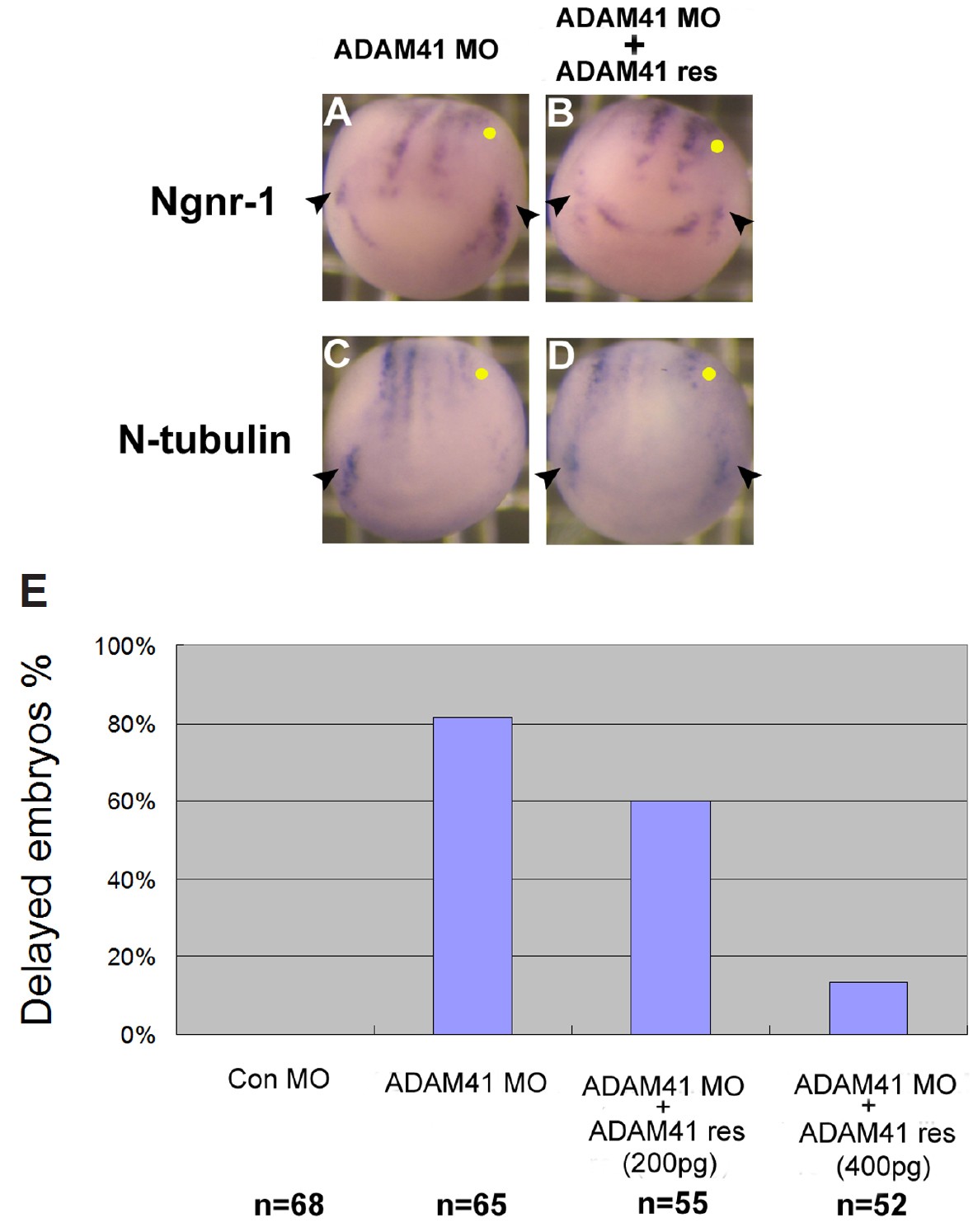 Fig. 7. Developmental delay phenotype caused by knockdown of ADAM41 was rescued by an exogenous ADAM41 transcript. (A-D) Co-injection of the ADAM41 rescue transcript into one cell of 2-cell stage embryos restored ngnr-1 and N-tubulin expression in trigeminal ganglia in ADAM41 morphants (B,D). Arrowheads point to the trigeminal ganglia, and the injected side is denoted with a yellow dot in each panel. (E) Summary of the effect of ADAM41 rescue transcript on the expanded ngnr-1 expression caused by ADAM41 morpholino. More than 80% of ADAM41 morphants displayed expanded ngnr-1 expression in the trigeminal ganglion. Co-injection of 200pg of ADAM41 rescue transcript reduced the number of abnormal embryos to 60%, and less than 20% embryos showed expanded ngnr-1 expression in the trigeminal ganglion when 400pg rescue transcript was used.