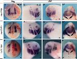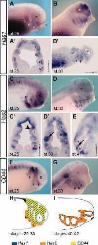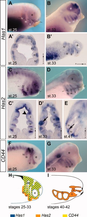 Figure 1. Expression profile of Has1, Has2, and CD44 mRNAs during cranial neural crest development. A,A′: Lateral view (A) and a vibratome horizontal section (A′) across the broken line in A of a stage-25 embryo showing Has1 expression in NCC migrating into the four branchial arches. B,B′: Lateral view (B) and a vibratome sagittal section (B′) of a stage-33 embryo showing Has1 expression in NCC migrated into the four branchial arches. C: Has2 is expressed in the branchial region of a stage-25 embryo. C′: The vibratome horizontal section across the broken line in C showing that Has2 is present in the endodermal layer of the branchial pouches as indicated by the arrowhead for the hyoid arch. D: At stage 33 Has2 mRNA is still present in the branchial region. D′: The vibratome horizontal section across the broken line in D highlights that the expression of Has2 is switched off in the endoderm, while it appears in the neural cresterived component of the branchial arches, as indicated for the third arch by the arrow. E: Magnification of a vibratome horizontal section of a stage-41 embryo showing Has2 expression in differentiating chondroblasts. F: The lateral view of a stage-25 embryo shows CD44 expression in the four cranial NCC migratory streams. G: The lateral view of a stage-33 embryo showing CD44 expression in NCC migrated into the four branchial arches. H,I: Drawings showing a comparative expression profile of Has1, Has2, and CD44 mRNA expression. I-II-III-IV, branchial arches; e, eye; h, heart; ov, otic vesicle; s, somites; M, Meckel's cartilage; Q, quadrate cartilage; C, ceratohyal cartilage; G, gill cartilages.