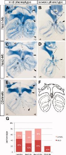 Figure 5. Skeletal alterations in Has1, Has2, and CD44 morphants. Stage-49 flat-mounted embryos processed for Alcian blue staining. All specimens are shown in a ventral view with the anterior to the top. A, C, E: Visceral skeleton of Has1 (A), Has2 (C), and CD44 (E) morphants showing a mild alteration of the skeletal elements derived from the four NCC migratory streams: the Meckel's, palatoquadrate, ceratohyal, and gill cartilages appear reduced in size in the injected side (arrows). B, D: Visceral skeleton of Has1 (B) and Has2 (D) morphants showing a severe alteration: in the injected side the gill cartilages are strongly reduced (arrows), while the other skeletal elements failed to develop. F: Scheme of a wild type visceral skeleton structure, modified from Sadaghiani and Thiebaud (1987). G: The percentages of mild and severe affected skeletons in the injected embryos. M, Meckel's cartilage; Q, palatoquadrate cartilage; C, ceratohyal cartilage; G, gill cartilages; Bh, basihyal cartilage.