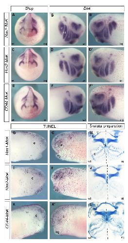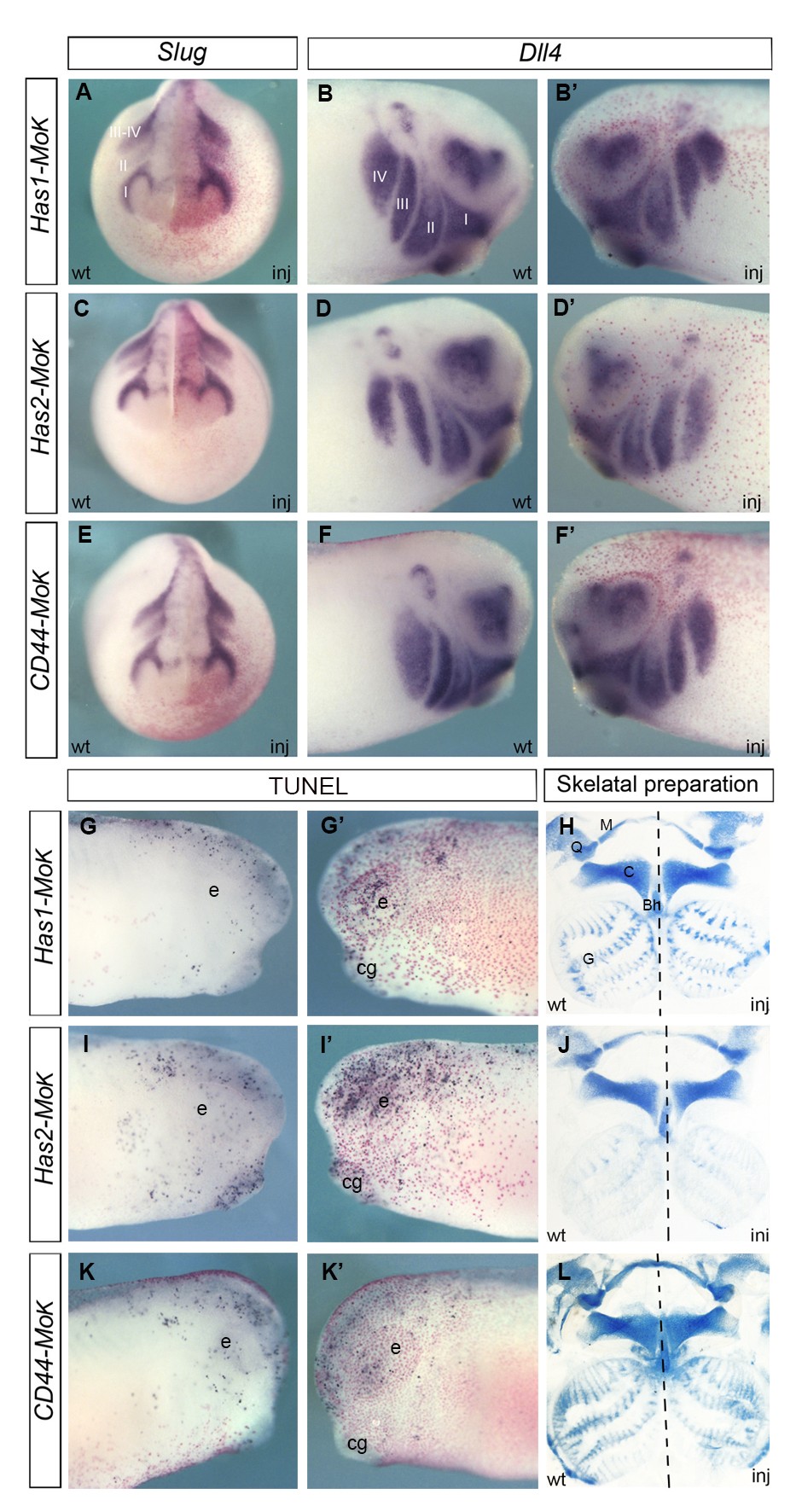 Supp. Fig. S1. Molecular and morphological analysis of embryos injected with Has1, Has2, and CD44 control morpholinos. The injected side of each embryo is identified by the red-gal staining. A': Cranial NCC migration occurred normally in embryos injected with Has1-MoK, Has2-MoK, and CD44-MoK as revealed by the gene expression of Slug and Dll4. G, G', I, I', M, M': In embryos injected with Has1-MoK, Has2-MoK, and CD44-MoK TUNEL-positive cells are detected within the brain and the eye but never in the branchial arches region. H, L, N: The NCC-derived visceral skeleton developed correctly in Has1-MoK, Has2-MoK, and CD44-MoK embryos. e, eye; cg, cement gland.