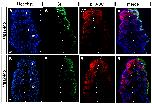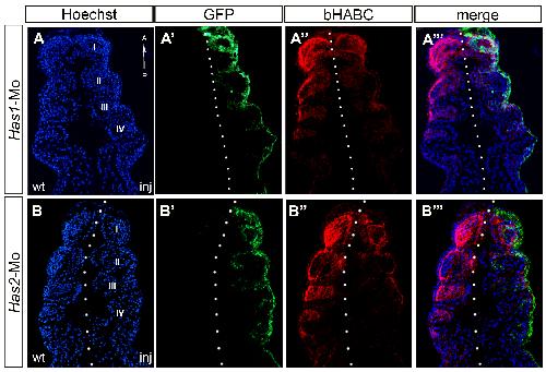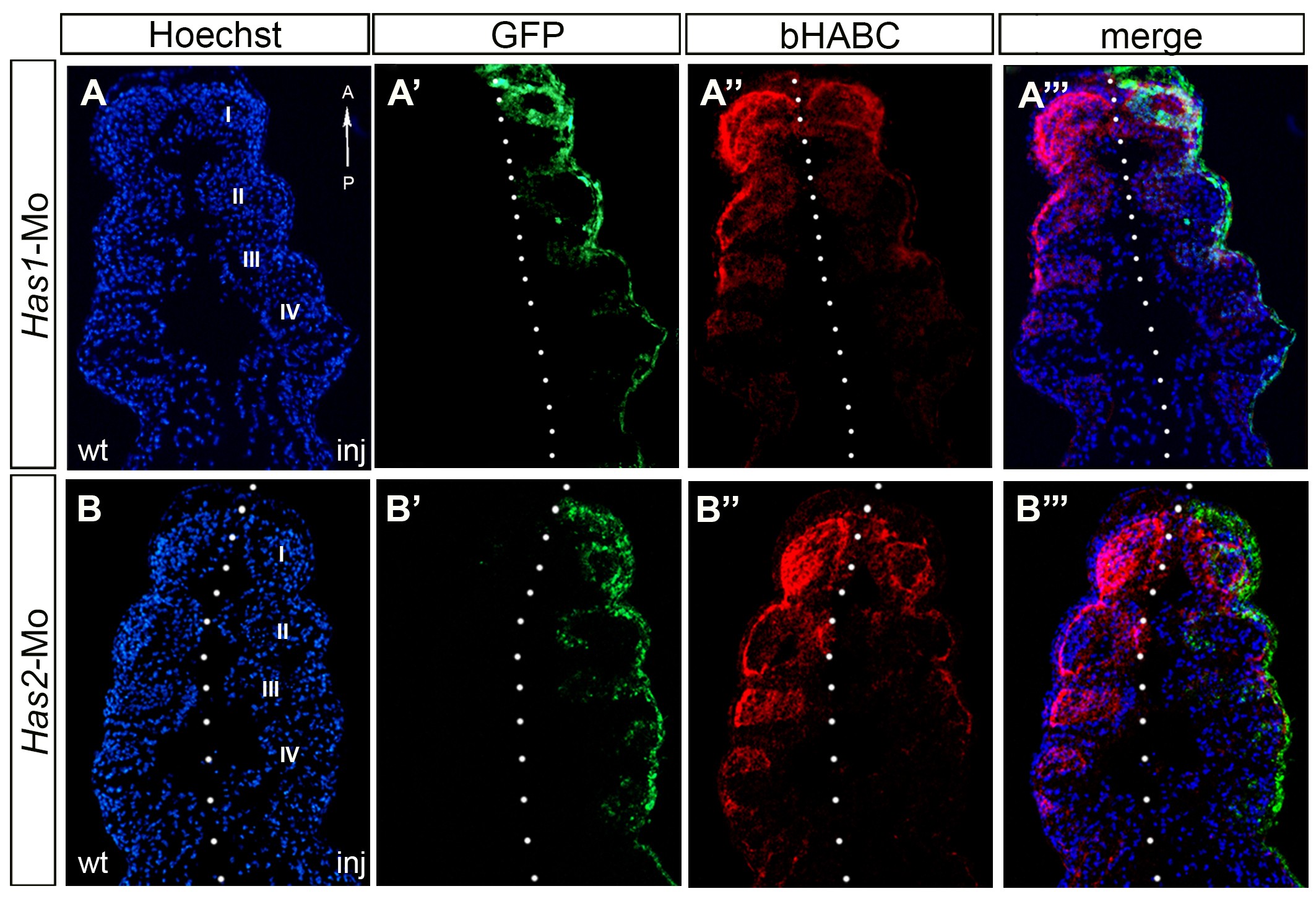 Supp. Fig. S2. Control experiments: hyaluronan distribution in branchial arches of Has1 and Has2 stage-33 morphants. A''', B''': Cryostat horizontal sections at the branchial level of Has1 and Has2 morphants, showing the Hoechst staining to visualize nuclei (A, B), the GFP fluorescence to identify the injected side (A', B'), the biotynilated Hyaluronan Binding Complex (bHABC) staining to detect hyaluronan (A'', B''), and the merge (A''', B'''). In the injected side of morphants, a decreased amount of hyaluronan is present in the branchial extracellular spaces with respect to the uninjected counterpart. I-II-III-IV, branchial arches.