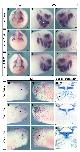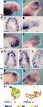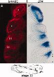 Figure 2. Hyaluronan distribution in branchial arches. A: Horizontal section of a stage-33 embryo. The biotinilated Hyaluronan Binding Complex (bHABC) staining detects hyaluronan, in red, in the extracellular matrix around post-migrated NCC. A′: The in situ hybridization with the skeletogenic NCC marker Dll4. Sections were made across the broken line drawn in the scheme of a stage-33 Xenopus tadpole, modified from Nieuwkoop and Faber (1956). I-II-III-IV, branchial arches.