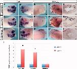 Figure 4. Increased apoptosis in the branchial region of stage-30 Has1 and Has2 morphants. A, D, G: Lateral views of the control side of Has1 (A), Has2 (D), and CD44 (G) morphants analyzed at stage 30 for Dll4 expression. A′, D′, G′: Injected sides of embryos in A, D, and G showing a significant reduction of post-migrated NCC streams size. B, B′, E, E′, H, H′: Lateral views of the control and injected side of stage-28 Has1, Has2, and CD44 morphants processed for TUNEL assay to highlight apoptotic cell death. C, F, I: Vibratome horizontal sections at the branchial level of Has1, Has2, and CD44 down-regulated embryos processed for TUNEL assay. Increased apoptotic signal in the branchial arches of the injected side is indicated by the arrows (C, F). L: Quantitative evaluation of apoptosis by measurement of the number of TUNEL signal-positive cells within the pharyngeal region of CD44, Has1, and Has2 down-regulated embryos. In the histogram, the average numbers of TUNEL-positive cells in Has1-Mo- and Has2-Mo-injected sides are, respectively, approximately 5-fold and 4-fold higher compared with the wt side. Statistically, no significant difference in the number of TUNEL-positive cells was found between the wt-side and CD44-Mo-injected side. Vibratome sections of the pharyngeal region of three embryos for each down regulation have been analysed. The comparisons were performed using the Student's t-test and the results presented as means SEM. P < 0.05 was considered to be statistically significant (*). I-II-III-IV, branchial arches; e, eye.