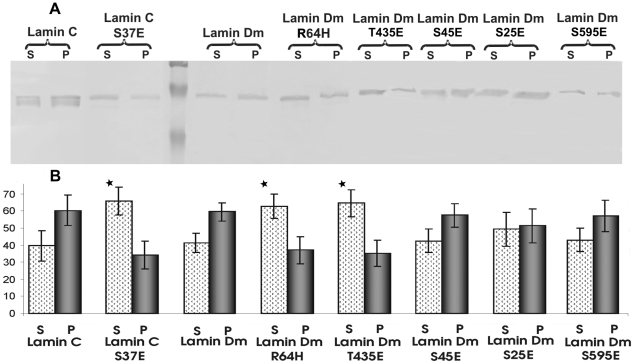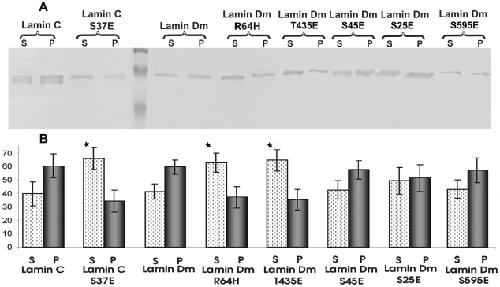 Figure 2. Phosphorylation of lamins changes their solubility in vitro.Panel A shows the typical result of sedimentation assay demonstrating polymerization ability of lamins. Proteins were allowed to polymerize for 60 min and centrifuged at 12 000×g for 20 min. Equal amounts of pellet and supernatant fractions were resolved onto 10% SDS PAGE followed by western blot with antibodies against D. melanogaster lamins. Panel B shows the diagram from the data obtained after quantification of the sedimentation assays. Data were obtained from three independent experiments.