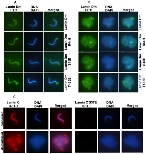 Figure 3. All bacterially expressed lamin proteins except lamin C mutant S37E bind Xenopus chromatin in vitro.Isolated Xenopus laevis sperm chromatin in condensed and decondensed form was used to assess the binding properties of lamin proteins and N-terminal fragment of Xenopus LAP2 protein. Lamin proteins were incubated with condensed and decondensed sperm chromatin for 15 min at room temperature. Preparations were then fixed in PBS buffer containing 1 mM EGS followed by spin down through a glycerol cushion onto a glass coverslip and processed for immunofluorescence microscopy analysis.