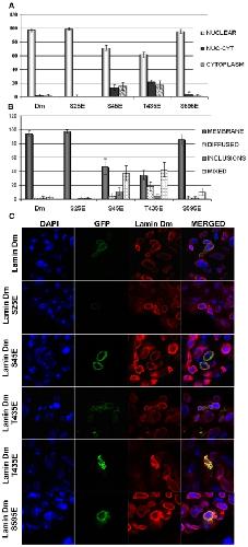 Figure 5. All lamin Dm mutants localize less efficiently to nuclear lamina in transfected HeLa cells but lamin Dm S45E, T435E and S595E mutants show significantly the lowest association with nuclear envelope.Localization of fusion GFP-lamin Dm and mutant proteins after 48 h (C) post-transfection into HeLa cells visualized under confocal microscope and quantitative analyses of appearance of the particular phenotypes (A and B). Exogenous lamin Dm proteins were visualized by eGFP fluorescence. Panel A demonstrates statistical analyses of distribution of lamin fusion proteins in nucleus only, in nucleus and cytoplasm, and in cytoplasm only. Panel B demonstrates statistical analyses of fusion proteins' localization to nuclear envelope and nuclear lamina (membrane), diffused phenotype, inclusion bodies phenotype and mixed phenotype respectively. Single confocal sections through the center of nuclei are shown. 200 cells were analyzed from at least 10 observation fields. Cells were stained for DNA with DAPI, for endogenous lamin A/C with mouse monoclonal antibodies Jol-2 and for lamin C alone with rabbit affinity purified antibodies. Staining with secondary antibodies was with goat anti-mouse secondary antibodies conjugated with TRITC and goat anti-rabbit secondary antibodies conjugated with Cy-5 respectively.