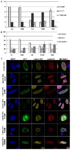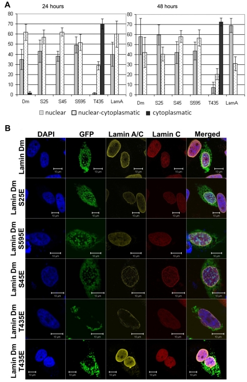 Figure 6. Farnesylation incompetent lamin Dm mutants do not localize efficiently to nuclear lamina and nuclear envelope.Localization of fusion GFP-lamin Dm and mutant proteins after 24 h (A) and 48 h (B) post-transfection into HeLa cells visualized under a confocal microscope and quantitative analyses of appearance of the particular phenotypes. Cells were stained for DNA with DAPI, for endogenous lamin A/C with mouse monoclonal antibodies Jol-2 and for lamin C alone with rabbit affinity purified antibodies. Staining with secondary antibodies was with goat anti-mouse secondary antibodies conjugated with TRITC and goat anti-rabbit secondary antibodies conjugated with Cy-5 respectively. Lamin Dm S25E and T435E were visualized by eGFP fluorescence. Single confocal Z-sections are shown through the center of nuclei. All typically observed phenotypes are shown for lamin Dm T435E mutant. Note the localization of lamin Dm T435E in the cytoplasm only.