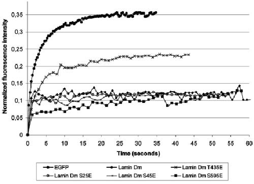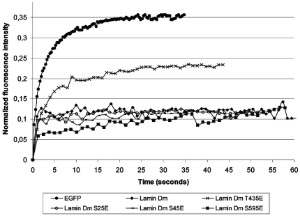 Figure 7. Graphical presentation of the data collected during FRAP experiments with farnesylation incompetent lamin Dm mutants in HeLa cells.Lamin Dm and all pseudophosphorylated mutants except lamin Dm T435E show the same low diffusion rate. Lack of recovery after photobleaching was observed for control human lamins (A, C and B1) (data not shown) as well as D. melanogaster wild type lamin Dm and the majority of lamin Dm mutants (S25E, S45E, S595E), excluding lamin Dm T435E. They showed no measurable recovery after several minutes. In contrast, lamin Dm mutant with threonine 435 substituted by glutamic acid to mimic stable, permanent phosphorylation displayed increased dynamics (D = 2.7 µm2/s; Mf = 20%). The presented fluorescence recovery curve shows that Drosophila lamins show similar mobility as human lamins in HeLa cells. Only specific mutation (T435E) can increase protein mobility, indicating lower polymerization ability in vivo. For control experiments we used HeLa cells expressing free EGFP. EGFP expression was seen to be evenly distributed within the nucleus and cytoplasm. Cytoplasmic fraction of EGFP shows a slower recovery (t1/2 = 2.05 seconds) versus that observed in the nucleus (t1/2 = 1.2 seconds).