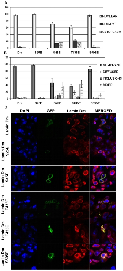 Figure 4. All lamin Dm mutants localize to nuclear lamina in transfected Drosophila S2 cells but lamin Dm S45E and T435E mutants show significantly different distribution.Localization of fusion GFP-lamin Dm and mutant proteins after 48 h (C) post-transfection into Drosophila S2 cells visualized under a confocal microscope and quantitative analyses of appearance of the particular phenotypes (A and B). Cells were stained for DNA with DAPI, for endogenous lamin Dm with mouse monoclonal antibodies ADL67. Exogenous lamin Dm proteins were visualized by eGFP fluorescence. Panel A demonstrates statistical analyses of distribution of lamin fusion proteins in nucleus only in nucleus and cytoplasm and in cytoplasm only. Panel B demonstrates statistical analyses of fusion proteins' localization to nuclear envelope and nuclear lamina (membrane), diffused phenotype, inclusion bodies phenotype and mixed phenotype respectively. Single confocal sections through the center of nuclei are shown. 200 cells were analyzed.