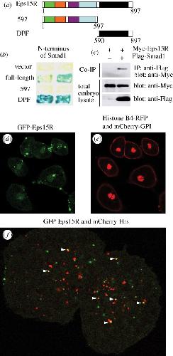 Figure 1. The endocytic adaptor protein Eps15R interacts with Smad1. (a) Xenopus Eps15R and deletion constructs. The N-terminal portion contains three Eps15 homology (EH) domains (green, orange and purple), followed by a coiled coil domain (blue) and carboxy-terminal DPF tripeptide repeat domain (black). (b) Eps15R binds to Smad1 in the yeast two-hybrid assay, as detected by β-galactosidase activity. Interaction requires the DPF domain of Eps15R. (c) Eps15R and Smad1 interact in Xenopus embryos. Embryos were injected with Myc-tagged full-length Eps15R mRNA alone or with Flag-tagged Smad1 mRNA. Lysates were immunoprecipitated (IP) with anti-FLAG antibodies and then western blotted with anti-Myc antibodies. Whole embryo lysates were immunoblotted with anti-Myc and anti-FLAG antibodies. (d) GFP-Eps15R is enriched in bright punctate foci located both juxta-membraneously and deeper within the cytoplasm of Xenopus animal cap cells. Lower fluorescence levels are found in the nucleus. (e) Histone B4-RFP and mCherry-GPI expression in cells shown in (d). (f) Limited co-localization of GFP-Eps15R and mCherry-Hrs 1 h after stimulation with 100 ng mlâ1 BMP4/7.