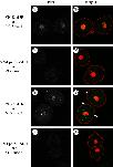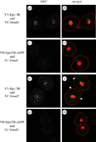 Figure 4. Differential compartmentalization of Eps15R/Smad complexes. Live imaging of Eps15R/Smad complexes monitored by bimolecular fluorescence complementation (BiFC). (a,c,e,g) Greyscale images of BiFC fluorescence. (b,d,f,h) Merged images of BiFC fluorescence in green and CFP-histone H2B (to label nucleus) and CFP-GPI (to label membranes) in red. Total numbers of cells scored for each BiFC complex were: n = 78 (Eps15R/Smad1); n = 27 (Eps15R-ÎDPF /Smad1); n = 45 (Eps15R/Smad2); n = 24 (Eps15R-ÎDPF/Smad2). (a,b) Cells injected with VN-Eps15R and VC-Smad1 have nuclear BiFC fluorescence, with enrichment in localized regions. (c,d) VN-Eps15R-ÎDPF does not interact with VC-Smad1. (e,f) Complexes of VN-Eps15R and VC-Smad2 are distributed in punctate dots throughout the cell. Some complexes are closely associated with the membrane (arrows), consistent with the known association of Eps15R with coated pits. (g,h) VN-Eps15R-ÎDPF does not interact with VC-Smad2.