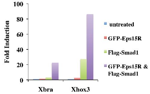 GFP-Eps15R mRNA replicates the activity of untagged Eps15R mRNA shown in Fig.2(h), synergising with Flag-Smad1 to induce the BMP targets Xbra and Xhox3 in animal caps. 2ng of each RNA were injected and the caps were harvested at NF11.5.