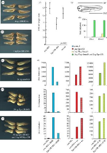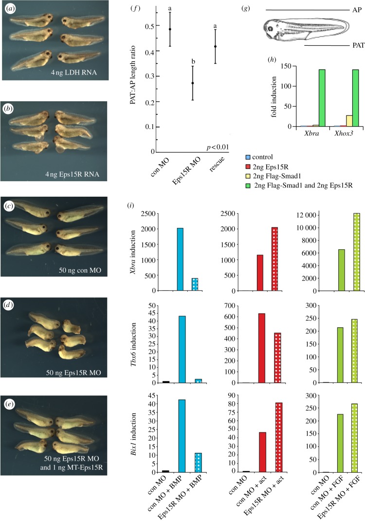 Figure 2. Eps15R enhances Smad1 signalling and is required for transcription in response to BMP signalling. (a,b) Over-expression of a control RNA encoding lactate dehydrogenase (LDH) does not impair development (a), whereas over-expression of Eps15R RNA causes defects in head and anterior mesoderm (b). (câe) Phenotypes of embryos injected with an antisense MO oligonucleotide targeting Eps15R. (c) Controls. (d) Embryos injected with Eps15R MO exhibit shortened axes and ventrolateral defects. (e) The phenotype in (d) is significantly rescued by co-injection of MT-Eps15R RNA. (f) Morphometric analysis of PAT : AP length ratio in these embryos. Measurements were subjected to ANOVA and Tukey's test for least significant difference. (g) Diagrammatic depiction of the PAT and AP measurements. (h) Expression of BMP targets Xhox3 and Xbra is elevated when Eps15R is co-expressed with Flag-Smad1 in the animal cap assay; caps were harvested at NF11.5. (i) Eps15R MO inhibits transcription of BMP-responsive genes in animal caps treated with 100 ng mlâ1 BMP4/7 heterodimers and harvested at NF11.5, yet there is no decrease in activation of these genes in response to 100 ng mlâ1 FGF4 (FGF) or 10 ng mlâ1 activin (act). Fold induction was calculated relative to control cap levels, and samples were normalized to the expression of ornithine decarboxylase.