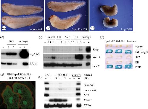 Figure 3. The DPF domain transactivates gene expression and differentially modulates Smad signalling. (aâc) Effects of over-expression of full-length Eps15R, or the DPF domain alone, on Xenopus development. (a) Uninjected embryos. (b) Embryos injected with 3 ng RNA encoding Eps15R. (c) Embryos injected with 3 ng RNA encoding the Eps15R DPF domain. (d) RT-PCR showing globin induction by the DPF domain in NF21 animal caps. (e) The DPF domain mimics the activity of Smad1 in the induction of Xbra and Xhox3 in NF11 gastrula caps but the full-length Eps15R lacks this ability. (f) Both full length Eps15R and the DPF domain can transactivate transcription in the yeast assay. (g) The cytoplasmic localization of GFP-Eps15R-δDPF is disrupted, displaying a diffuse, reticulated cytoplasmic distribution, in contrast to the punctate cytoplasmic localization of the full-length version shown in figure 1d. Nuclear enrichment is retained in the absence of the DPF domain. (h) The DPF domain antagonizes the ability of Smad2 to induce expression of genes such as chordin, goosecoid and Frzb in NF11 gastrula animal caps, which instead activates the ventral marker Xhox3.