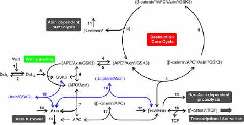 Figure 1. Reaction Scheme for Wnt SignalingThe reaction steps of the Wnt pathway are numbered 1 to 19. Protein complexes are denoted by the names of their components, separated by a slash and enclosed in brackets. Phosphorylated components are marked by an asterisk. Single-headed solid arrows characterize reactions taking place only in the indicated direction. Double-headed arrows denote binding equilibria. Blue arrows mark reactions that have only been taken into account when studying the effect of high axin concentrations. Broken arrows represent activation of Dsh by the Wnt ligand (step 1), Dsh-mediated initiation of the release of GSK3β from the destruction complex (step 3), and APC-mediated degradation of axin (step 15). The broken arrows indicate that the components mediate but do not participate stoichiometrically in the reaction scheme. The irreversible reactions 2, 4, 5, 9–11, and 13 are unimolecular, and reactions 6, 7, 8, 16, and 17 are reversible binding steps. The individual reactions and their role in the Wnt pathway are explained in the text.