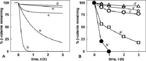 Figure 2. Kinetics of β-Catenin Degradation: Simulation and Experimental Results(A) Simulated timecourses of β-catenin degradation. The straight line for t < 0 corresponds to the reference state of β-catenin using the parameters given in the legends of Table 1 and 2. In vitro conditions are simulated by switching off synthesis of β-catenin and axin (ν12 = 0, ν14 = 0 for t ⥠0). Curve a: reference case (no addition of further compounds); curve b: addition of 0.2 nM axin; curve c: addition of 1 μM activated Dsh (deactivation of Dsh was neglected, k2 = 0); curve d: inhibition of GSK3β (simulated by setting k4 = 0, k9 = 0); curve e: addition of 1μM TCF. Addition of compounds (axin, Dsh, TCF) and inhibition of GSK3β was performed at t = 0.(B) Experimental timecourse of β-catenin degradation in Xenopus egg extracts in the presence of buffer (curve aâ²), axin (curve bâ²: 10 nM), Dsh (curve câ²: 1 μM), Li+ (curve dâ²: 25 mM), or Tcf3 (curve eâ²: 1 μM).