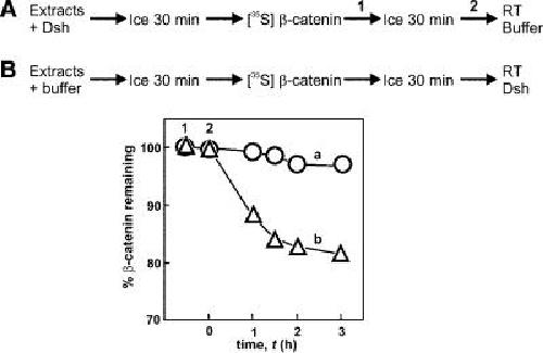 Figure 3. Preincubation of Dsh in Xenopus Egg Extracts Abolishes the Lag in Dsh ActivityLabeled β-catenin was incubated in Xenopus extracts on ice 30 min prior to (B) or 30 min after (A) the extract had been preincubated with 1 μM Dsh. No degradation of the labeled β-catenin was detected while the reactions were on ice. The reactions were started by shifting to 20°C.