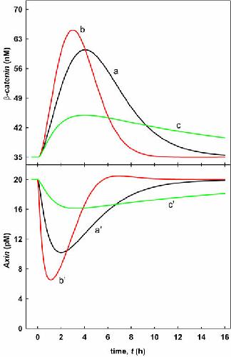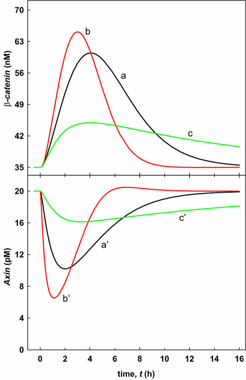 Figure 6. Timecourse of β-Catenin and Axin Concentrations Following a Transient Wnt StimulationTransient activation of the pathway is modeled assuming a Wnt stimulus that decays exponentially (Equation [6] with ÏW = 1/λ = 20 min) starting at t0 = 0. The straight line for t < 0 corresponds to the steady state before pathway stimulation. The curves are obtained by numerical integration of the differential equation system (see Dataset S1). The various curves for β-catenin and for axin differ in the turnover rate of axin determined by the parameters ν14 and k15 (curves a: reference values of these parameters; curves b: increase by a factor of 5; curves c: reduction by a factor of 5). All other parameters are given in the legend of Table 2.