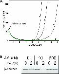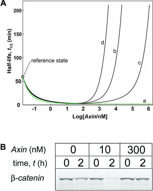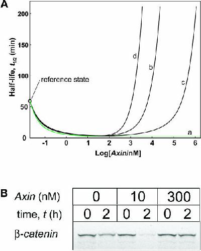 Figure 7. Effects of Increasing Axin Concentration on β-Catenin Degradation(A) Effect of axin concentration on β-catenin half-life. Curve a: reference case (K18, K19 > 1 nM, ordered mechanism); curve b: K18 = 1 nM, K19 > 1 nM; curve c: K18 > 1 nM, K19 = 1 nM; curve d: K18 = 1 nM.(B) High concentration of axin inhibits β-catenin degradation in Xenopus egg extracts. Labeled β-catenin was incubated in Xenopus extracts in the absence (0 nM) or presence of moderate (10 nM) and high (300 nM) concentrations of axin. Moderate concentrations of axin greatly accelerate, whereas high concentrations inhibit β-catenin degradation.