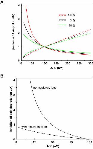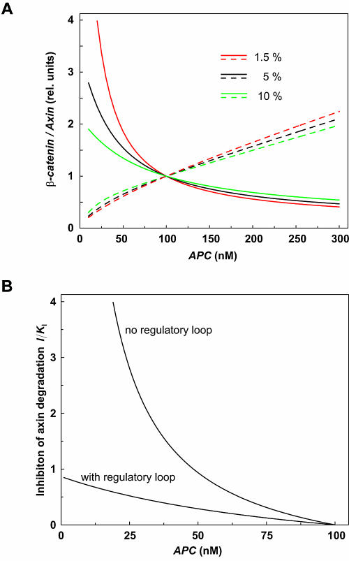 Figure 9. Effects of the Alternative β-Catenin Degradation Pathway and of Axin Degradation at Low Concentrations of APC(A) The alternative β-catenin degradation pathway (axin independent) can have profound effects on β-catenin levels at low APC concentrations. Variations of β-catenin and axin resulting from changes in APC concentration were calculated from the standard stimulated state. Relative variations were plotted since variation in the share of alternative degradation (1%, 5%, and 10%) results in changes of the standard stimulated state (all parameters are constant). β-Catenin and axin levels for varying contributions of the alternative degradation pathway are as follows: 1.5%, β-catenin 178 nM, axin 0.00728 nM; 5%, β-catenin 151 nM, axin 0.00679 nM; 10%, β-catenin 125 nM, axin 0.00629 nM.(B) Inhibition of axin degradation reduces β-catenin concentration after loss of APC. Plotted is the concentration of a potential proteasome inhibitor I (scaled to its inhibition constant, KI) necessary to reduce β-catenin concentration to its original level, depending on the concentration of APC.