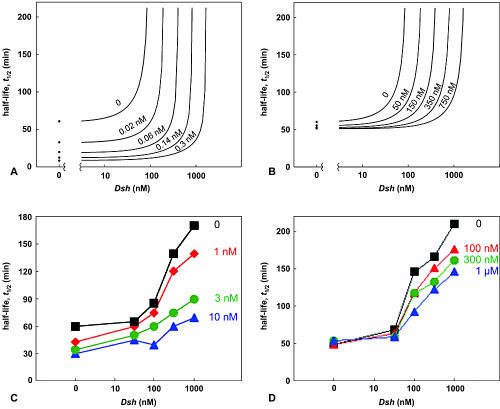 Figure 4. The Effect of Dsh versus Axin or GSK3β on the Half-Life of β-Catenin in Xenopus Extracts(A and B) Predicted effects of Dsh, axin, and GSK3β on the half-life of β-catenin degradation. The half-lives are calculated from simulated degradation curves. Data are plotted as function of added Dsh (logarithmic scale) for various concentrations of axin (A) and GSK3β (B).(C and D) Measured effects of Dsh, axin, and GSK3β on the half-life of β-catenin degradation. Stimulation of β-catenin degradation by axin occurs throughout the range of Dsh concentrations tested. (C) Axin increases the rate of β-catenin degradation even in the absence of added Dsh. (D) Stimulation of β-catenin degradation by GSK3β is detected only at high concentrations of Dsh. No effects of GSK3β on β-catenin degradation can be detected at less than 30 nM added Dsh. There is a disparity between the concentrations of axin in the experimental and theoretical curves. We assume that this is most likely due to the specific activity of the expressed axin protein.